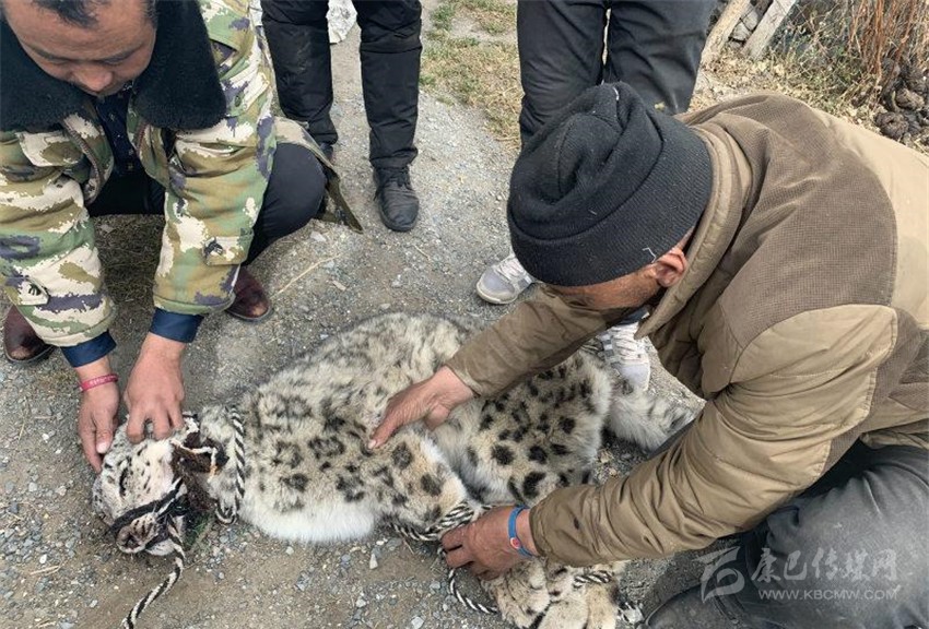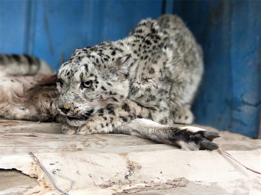 不放心受傷雪豹的隊員們隨即將發(fā)現(xiàn)的情況按屬地管理原則上報了該鄉(xiāng)黨委政府,聯(lián)系了行業(yè)主管部門林草局,并上報縣委縣政府,縣委政府主要領導高度重視要求鄉(xiāng)黨委政府和林草局賡即組織人員再到現(xiàn)場附近搜尋受傷雪豹看是否需要救治。當一行人再次來到現(xiàn)場,發(fā)現(xiàn)受傷的雪豹可能由于舍不得“獵物”去而復返正趴在巖羊旁,也可能由于傷情見人前來并未離去。大家在簡單商議后,決定先由獸醫(yī)為雪豹現(xiàn)場查驗傷勢。為防止雪豹傷人,在大家的配合下做出必要的防護措施后,開始為雪豹查驗傷勢,經(jīng)查驗發(fā)現(xiàn)該雪豹左前肢和左后肢均被咬傷,其中左前肢受貫穿性咬傷,傷勢較重,造成其無法行走,隨即大家決定將雪豹帶回救治。