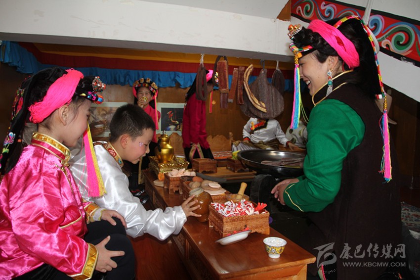 筆者正在參觀時(shí),老師帶領(lǐng)著一群可愛(ài)的孩童走進(jìn)鍋莊房?jī)?nèi)。孩子們脫下鞋襪,盤膝坐在藏床上,一邊做著喝酥油茶的樣子,一邊唱起古老的嘉絨歌謠。稚嫩的嗓音中,遠(yuǎn)古文化煥發(fā)出新時(shí)期的獨(dú)特魅力。老師則坐在火籠邊,不斷地“忙碌”著。孩子們“吃飽喝足”后,走到房屋主人的扮演者老師面前鞠躬致謝,文明禮儀也得到了升華。
