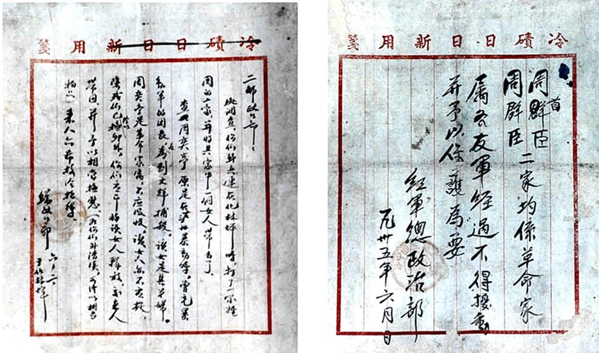 1935年6月2日,劉伯承同志寫給2師政治部的信。周奕庭是劉伯承順、瀘起義部隊(duì)的團(tuán)長(zhǎng),起義失敗后轉(zhuǎn)入地下,1932年在成都被捕后遇害。紅2師先頭部隊(duì)抵達(dá)化林坪時(shí)錯(cuò)將其家屬當(dāng)作 “土豪”,抓走其弟媳。劉伯承同志為此給2師政治部寫信,說明其家為革命烈屬。其弟媳很快得到釋放,其家屬也得到了保護(hù)。