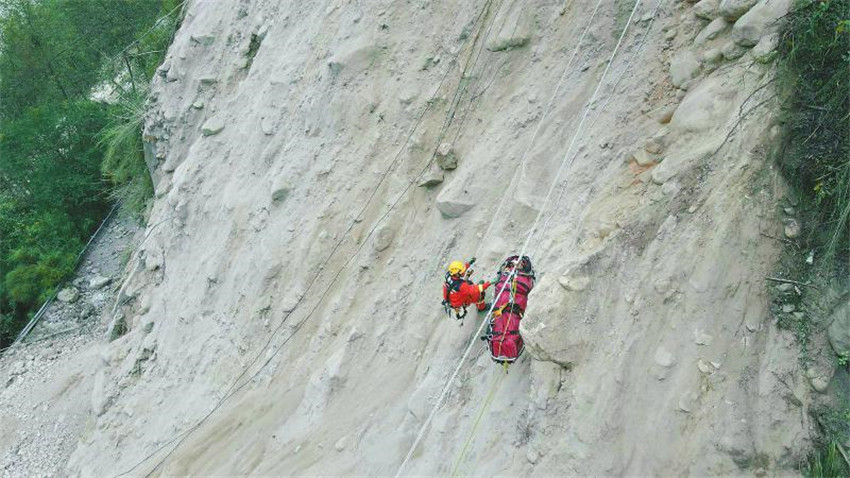 9月7日18時許,救援人員從海螺溝景區(qū)將一位受傷群眾用擔架運出。因景區(qū)通往磨西鎮(zhèn)的主干道還在搶通中,救援人員采取吊繩、拖拉的方式,將受傷群眾從斷道處向上運送到落差一百多米的安全處,再由等候的救護車運送至醫(yī)療點。四川日報全媒體記者 吳聃 攝