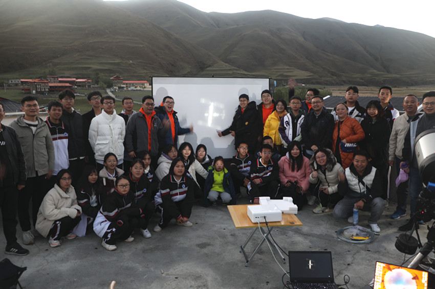 “向天空出發(fā)”公益幸福團(tuán)成員和瀘定中學(xué)師生們展示捕捉到的“天宮”空間站影像。