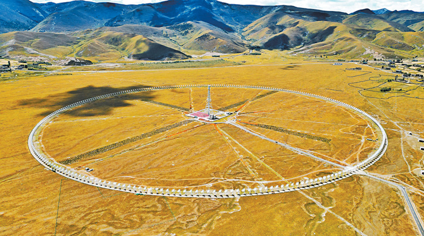 飛機(jī)從稻城亞丁機(jī)場(chǎng)起飛,右側(cè)舷窗外的地面隱現(xiàn)一個(gè)小圓點(diǎn),因?yàn)樵煨吞厥猓?dāng)?shù)厝朔Q(chēng)“千眼天珠”。小圓點(diǎn)其實(shí)一點(diǎn)也不“小”——在海拔3820米的甘孜州稻城縣噶通鎮(zhèn),313部直徑6米的天線(xiàn),均勻地分布在直徑1公里的圓環(huán)上。它的正式名字叫圓環(huán)陣太陽(yáng)射電成像望遠(yuǎn)鏡(下稱(chēng)“圓環(huán)陣”),是國(guó)家重大科技基礎(chǔ)設(shè)施空間環(huán)境地基綜合監(jiān)測(cè)網(wǎng)(子午工程二期)的標(biāo)志性設(shè)備之一,也是目前已建成的全球規(guī)模最大的綜合孔徑射電望遠(yuǎn)鏡。其任務(wù)主要是對(duì)太陽(yáng)和日地空間傳播鏈條進(jìn)行高質(zhì)量監(jiān)測(cè),監(jiān)測(cè)太陽(yáng)“打噴嚏”。