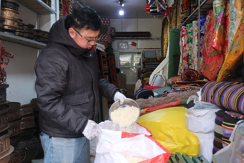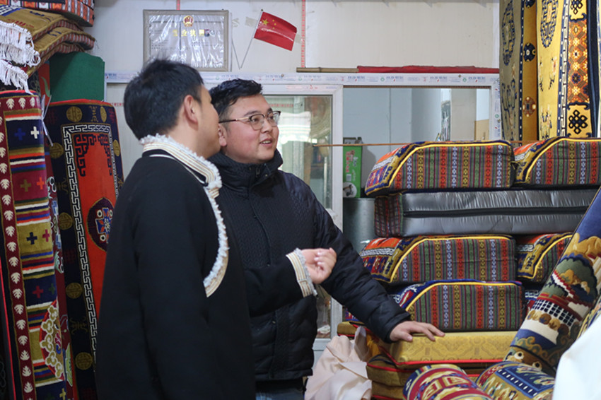這個(gè)30多平方米的商鋪內(nèi)人頭攢動(dòng),地毯、布料、銅鍋……各種物品應(yīng)有盡有?!疤鹤佑昧舜蟀肽炅?,質(zhì)量還是這么好,不僅沒(méi)變形,顏色還是那么鮮艷,所以今天專門(mén)來(lái)再買(mǎi)一個(gè)拿回家備用。”客人尼瑪說(shuō)。