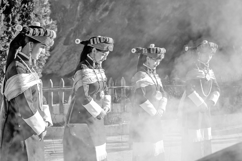 嘉賓體驗團首先來到位于甲居藏寨景區(qū)里的“點石·寶生居”特色民宿,只見一位年邁的嘉絨長者正主持“成人禮”儀式,桑煙裊裊,為即將成年的少女送去了誠摯祝福。完成儀式的嘉絨姑娘們隨長者一同跳起了非遺傳統(tǒng)舞蹈孔雀鍋莊,千年前東女古國的風(fēng)采得以重現(xiàn)。