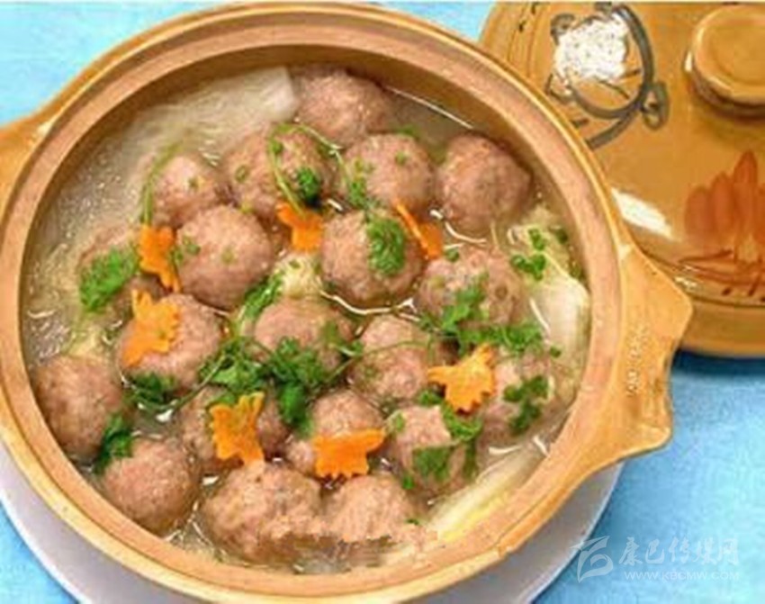 4、用微火把菜鍋中的酥油化成液體后加入生姜片、鹽、野生蒜、少量水、水?dāng)嚩狗郏谐沙霈F(xiàn)沸泡的時(shí)候,澆在魚肉丸子上蟲草魚肉丸這道菜做成了。
