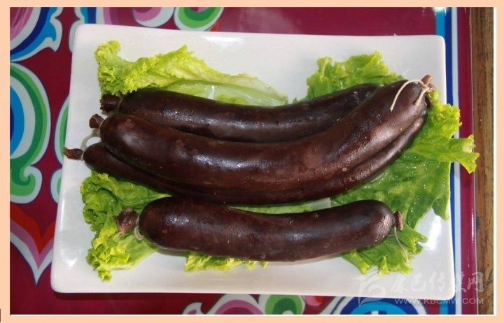 血腸:是將宰殺牲畜的血與玉米面或麥面、蕎面混合在一起,再加以食鹽、花椒面等香料提味,然后將混合物裝進洗干凈的牲畜腸里,人鍋煮熟即可。吃的時候,或蒸或烤:蒸則腸衣柔軟很有嚼頭;烤則腸衣香脆可口。因為血腸不能長時間保存,所以吃血腸的時間一般在宰殺牲畜的幾天內。