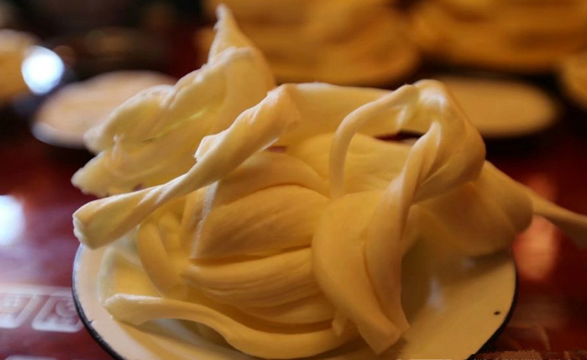 酥油古稱醍醐,元代才開始叫酥油。元代宮廷食醫(yī)思慧在《飲膳正要》中記述了酥油的提取方法:“取凈奶子,不住手用阿赤打,取浮油者為思馬哥油,今亦云曰酥油。”文中“阿赤”是提取酥油的木器。提取酥油有專門的酥油桶,桶里有一個連桿木柄,倒上牛奶,蓋上桶蓋后,連續(xù)上下抽動連桿木柄數(shù)百上千次,黃澄澄的酥油塊就全部浮在上面了。把酥油塊用手捏成坨,擠去水份,丟進清水里泡一會兒,就可以食用了。現(xiàn)在牧區(qū)打酥油普遍用奶油分離器,既快又省。