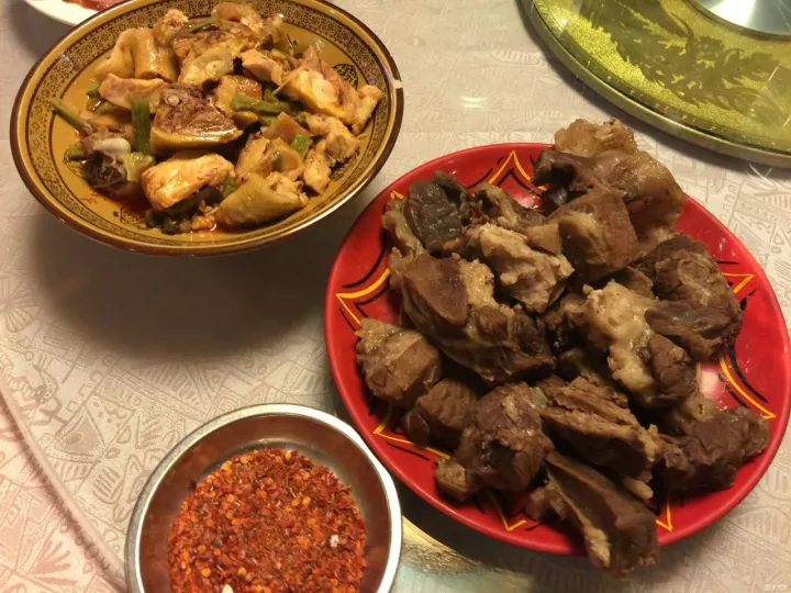 藏族同胞好將牛羊肉大塊入鍋大火煮之,剛過心則撈起。吃時手抓刀削入口,謂之手抓砣砣內。冷熱食皆佳,肉嫩味鮮?,F(xiàn)在迎合大眾口味,有些用炒,有些用烤,蘸著海椒面,味道簡直美味極了。