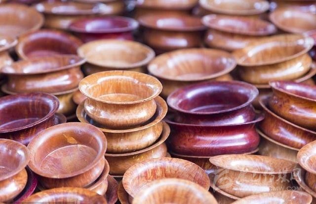 按藏族傳統(tǒng),一般人使用得最多的餐具是木碗。木碗一般用樺木、雜木雕琢而成,質(zhì)地結(jié)實,不易破裂,花紋細膩,較為美觀。木碗的制作過程,一是選材,二是風干,三是制坯,四是細磨,五是上色。藏族木碗可分為大碗、小碗、蓋碗、套碗、木缽等多種,用途廣泛,可供喝茶,吃糌粑,存放食品、香料、佐料等,而且還具有光滑、細致、美觀、適用、不變味、喝茶香、攜帶方便等特點。雜木碗還有防毒的優(yōu)點。至于純金、純銀做成的勺子、筷子、碗和盤,雖然在民間也能見到,但畢竟不是被普遍使用的生活用品,一般給客人奉茶都使用瓷碗。