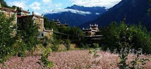 在青山腳下,綠樹環(huán)抱,小溪流徑之地,遠遠地便能看見屋檐下、窗戶的壁墻上勾畫著象征純潔白線的藏寨民居。一幢幢藏寨民居那么和諧地與大自然構(gòu)成一幅美麗的風(fēng)景。
